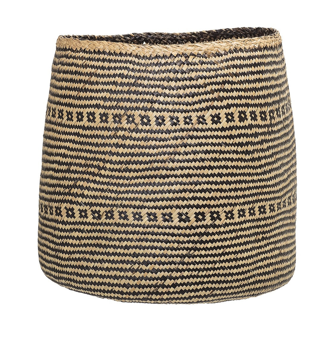 Panier en fibres naturelles (jonc de mer), motifs graphiques, tressage noir et naturel.